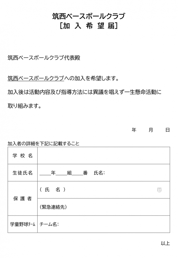 プリンターをお持ちの方は、加入希望届をダウンロード・プリントアウトし、必要事項をご記入の上、旭ヶ丘一般野球場までご持参ください。