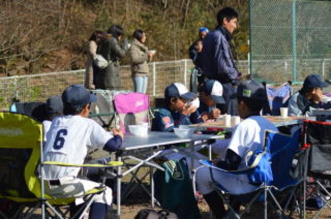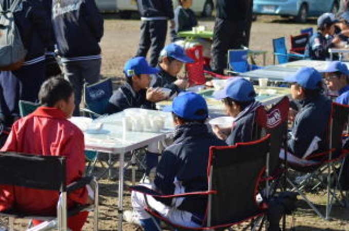 半日の体験を終えた後は、ブレーブスの保護者が手作りした豚汁を食べてもらいました。