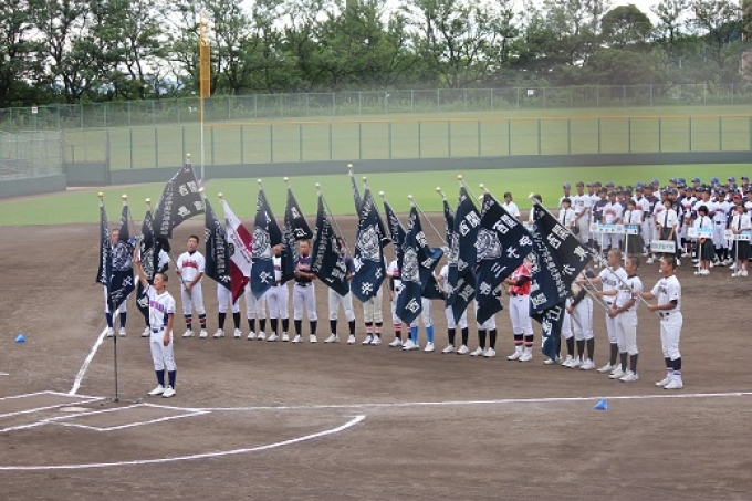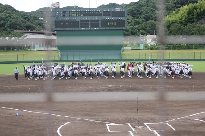 同年代のブラスバンドの演奏は素晴らしく、女子中学生のプラカード先導、女子野球の大学生のお姉さんも参戦などいつもより華やかな開会式でした。