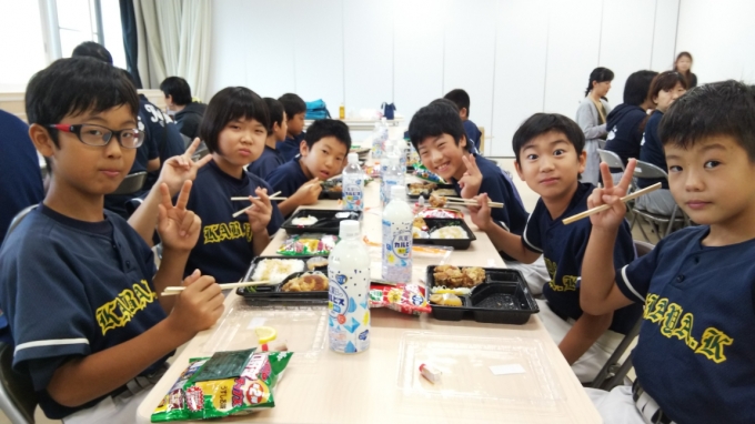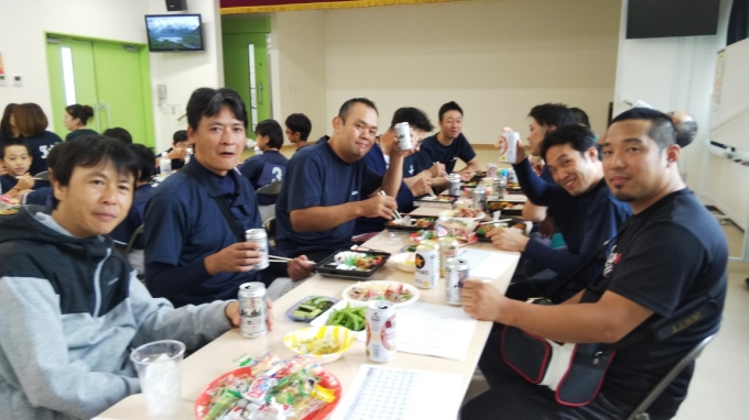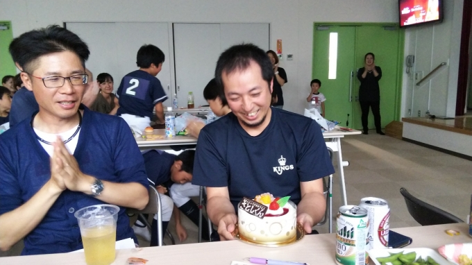 7/14(日)13時~蒲谷キングスの前期納会を行いました。佐宗副代表からご挨拶をいただいた後、みんなで食事~前期成績発表~ゲーム大会と楽しい時間を過ごしました。選手たちも普段の練習・試合とは違う表情を見せてくれました。この日、お誕生日を迎えた遠藤事務局長にサプライズでケーキがプレゼントされました!