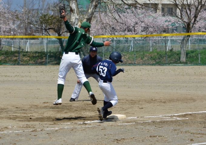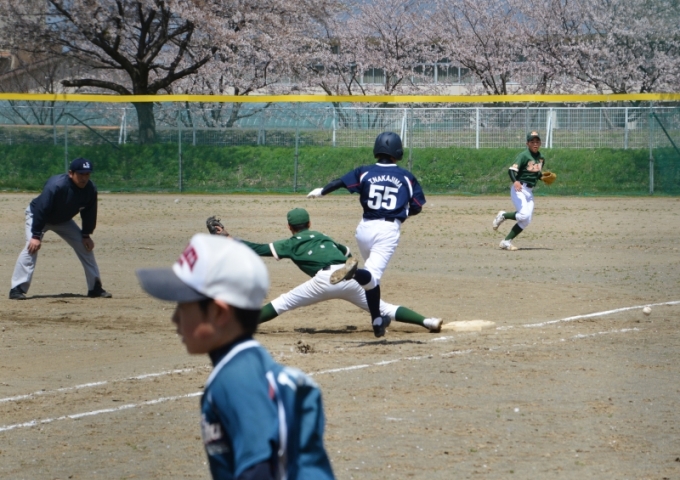 二塁手本間 後方への飛球に一歩及ばず 背景の桜がシュールだ