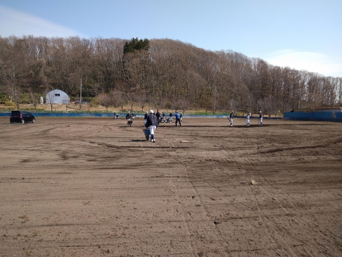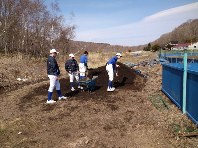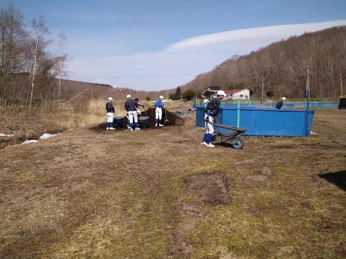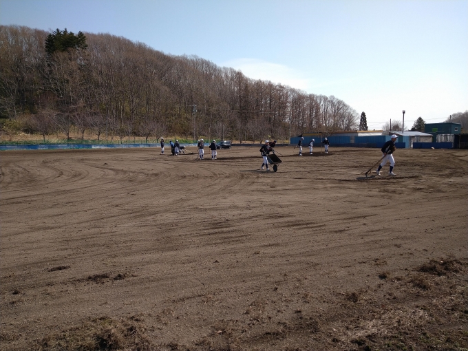 グランドの雪もやっと解けて本日より半年ぶりにグランド練習がスタートします。しかしすぐにグランドは使えません。先ずはみんなで大掛りなグランド整備・土運びなどが必要なのです。今日は主にそちらがメインの日となりました。