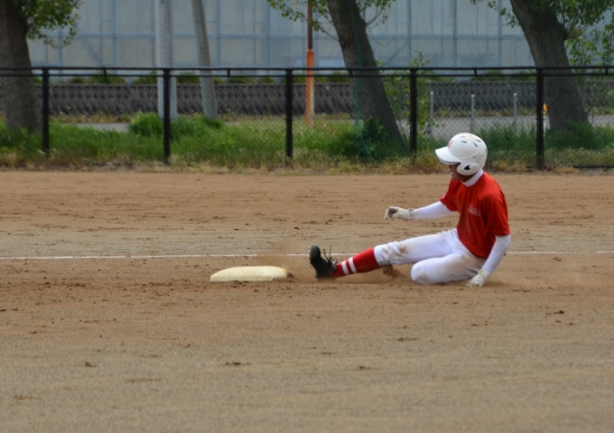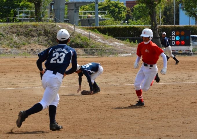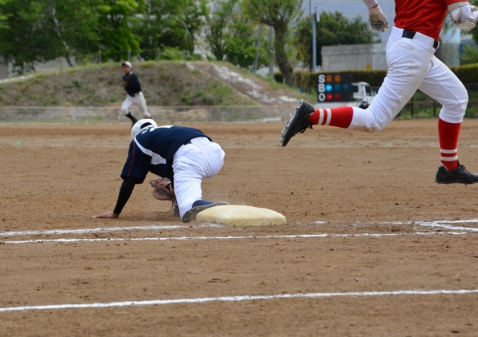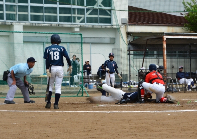 本塁をつくが,僅かに及ばず