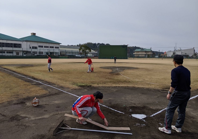 寒さ盛りの東京からアクアライン・海ほたるを渡り、グランドは睦沢町総合運動公園グランド、宿舎は旧睦沢町立瑞沢小学校をリノベーションした「kitみずさわ」を利用させていただき、朝から晩まで身体も頭も動かす「野球づくし」の2日間になりました。