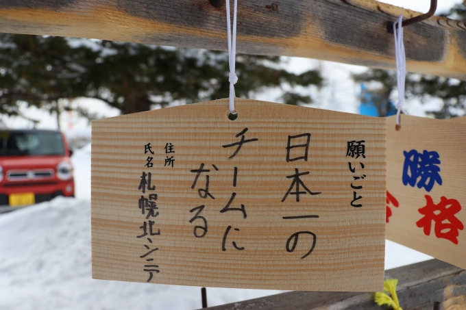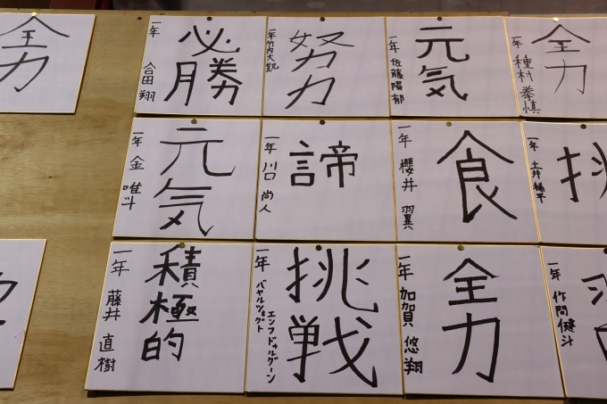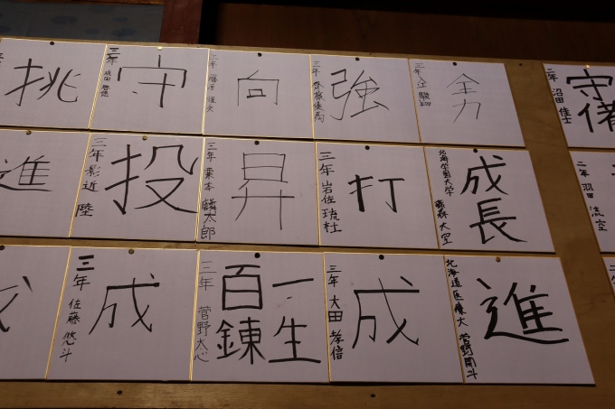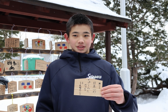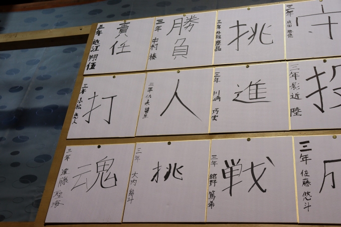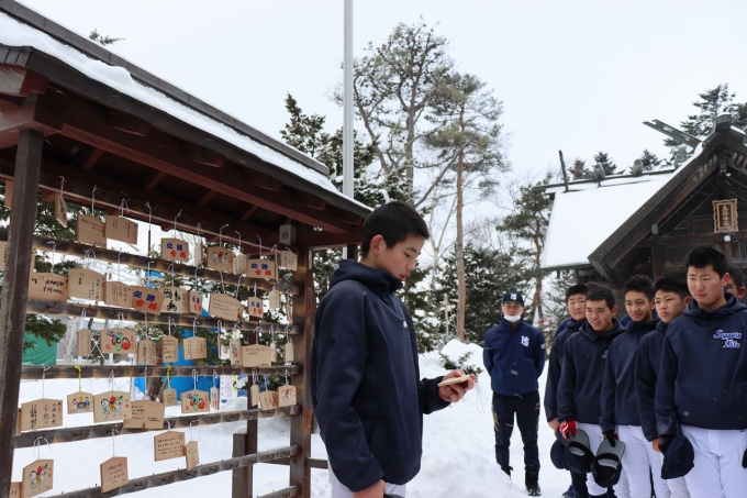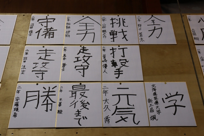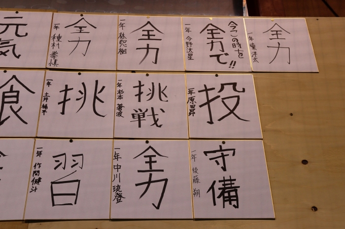 全員で必勝祈願の参拝後、各選手が抱負を色紙に記し、