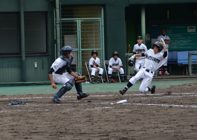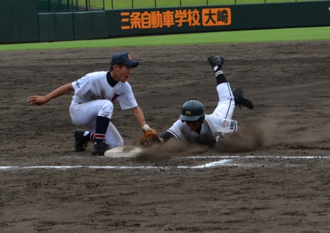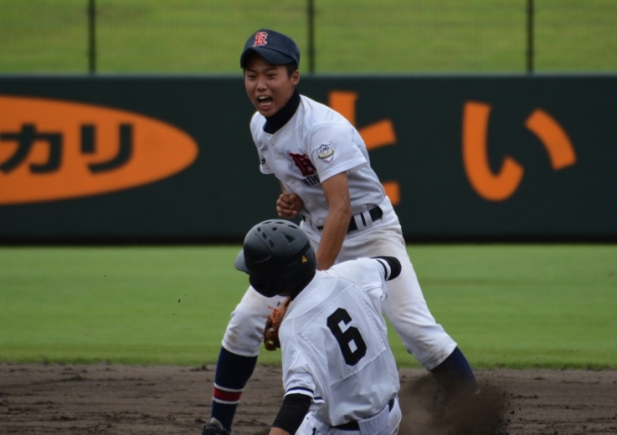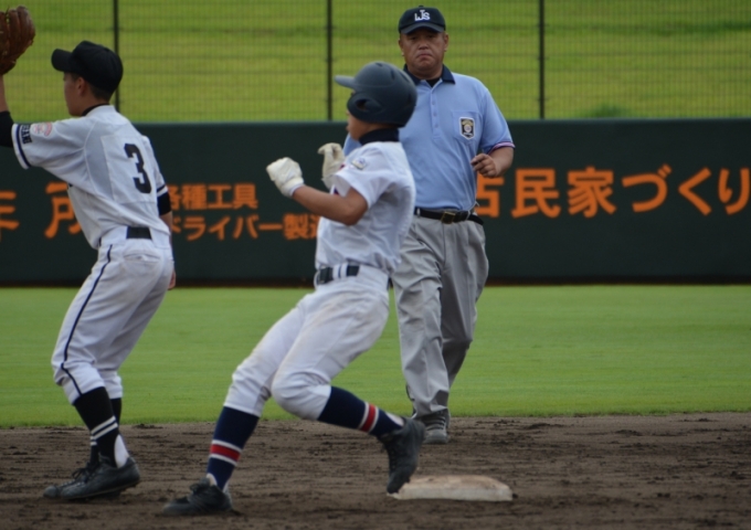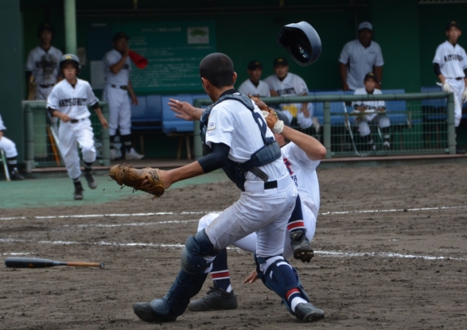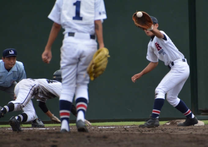 中川の好返球でタイミングはアウトだがタッチが遅れる