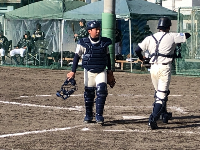 おニューのキャッチャー道具の似合う山根っち