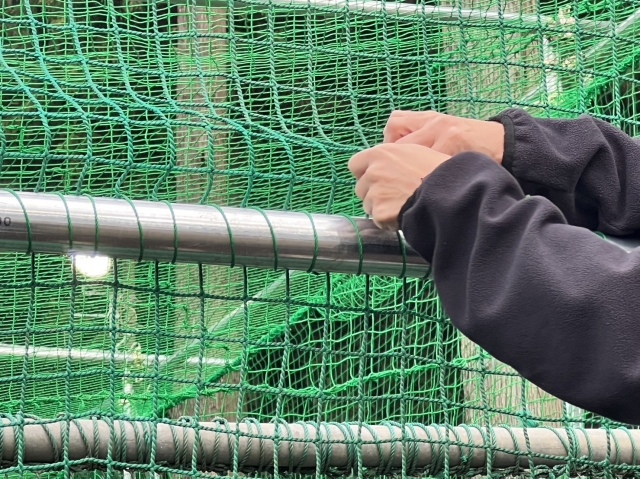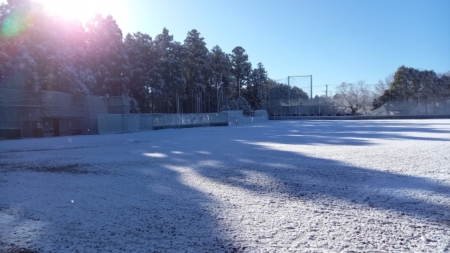 グラウンドがうっすらと雪化粧。翌日の練習試合に向け、グラウンド整備にも力が入ります。