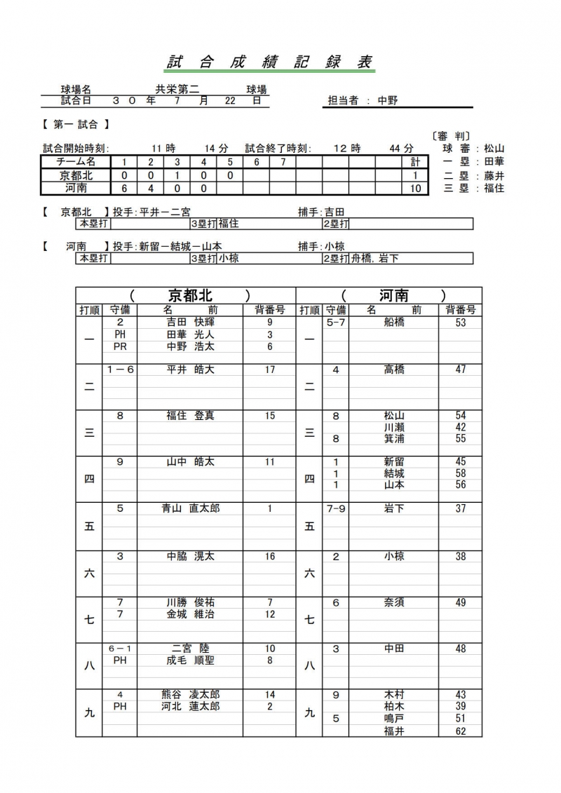 試合結果一覧 > 第3回近畿1年生大会 京都北リトルシニア 対 河南