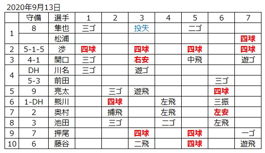 4回から渉がマウンドに上がる。4回は三者凡退、5回はピンチを背負いながらも無失点で切り抜けた。しかしながら、6回に2つの安打と四球で無死満塁のピンチを背負う。三遊間を抜ける安打で1点を許す。遊撃へのゴロで1死を奪うが、1番打者にエンタイトルツーベースを放たれ2点を奪われた。