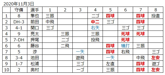 安打を放ちチャンスメイク。前田、池田、奥村のおっさんトリオを優秀選手に選びます。