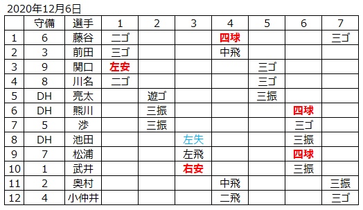 5回も2つの四球で2死1,2塁とチャンスを広げたが、武井が三振に倒れ無得点。