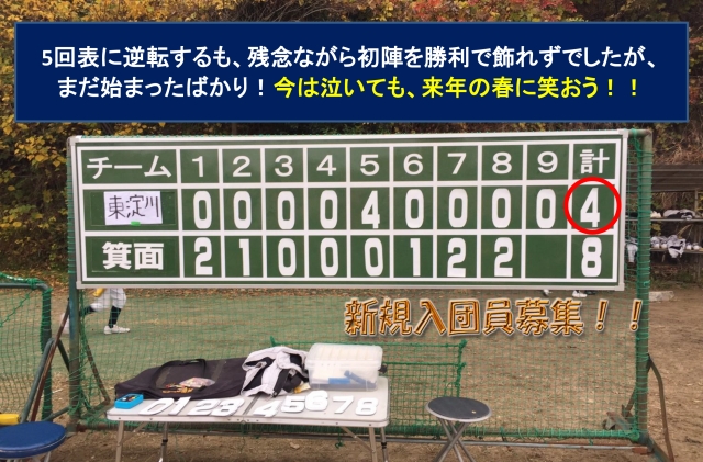 5回表に逆転するも、初陣は白星スタートという訳にはいきませんでしたが、各々の課題や反省点が見えたら次に繋がります。来週土曜日は箕面ボーイズさんとのリベンジ戦!!日曜日は大正ボーイズさんと練習試合!!この冬にたくさんの経験と練習を栄養にして春を迎えましょうね!