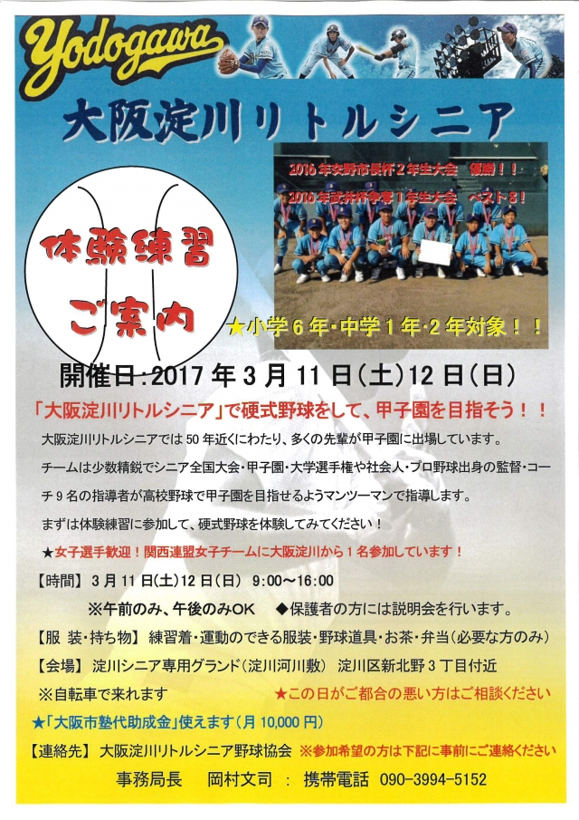 大阪淀川シニアは今年度は2年生7名、1年生10名と少数ながら、豊富な練習量と監督・コーチのマンツーマンの指導により、確実に力を付けて来ています。