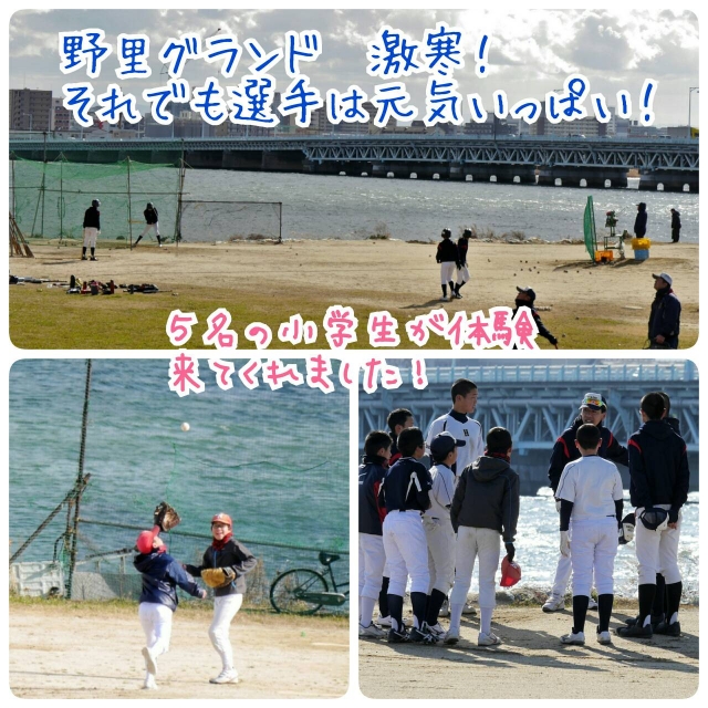 5名の小学生が体験に来てくれました!本日は、風も強くて冷たくて、もう指先や耳なんかもじんじん痛くなる、この冬一番の寒さのグランドでした。だけど、選手たちは、寒さを感じさせない元気さで、練習を頑張っていました。若いってほんと凄い( ☆∀☆)!!