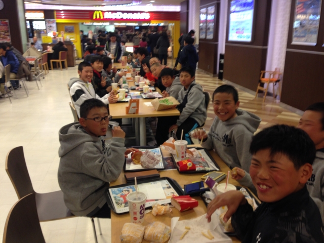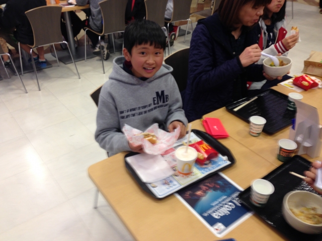 足柄SAで夕食です。子どもたちは各々好きなものを買って食べています。みんな元気です!