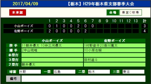 初回佐野の攻撃、四死球を足掛かりにヒットを重ね2点を先制…しかし小山2回の攻撃、四球でランナーを出すと送りバント内野安打、スクイズで一点を返される…その後は、4回までお互いが得点を奪えず2-1で前半を終えた
