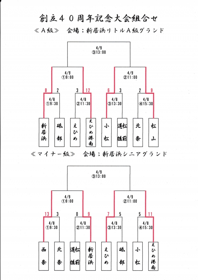 4月8日(土)に行われました「新居浜リトルリーグ創立40周年記念大会」の1回戦結果を更新しました。