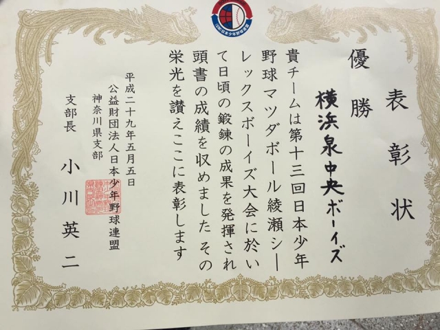 第13回マツダボール綾瀬シーレックスボーイズ大会に沢山の応援ありがとうございました。今年から連盟の公認大会として認定された記念すべき大会に見事優勝する事が出来ました。(2年ぶり3回目の優勝)この勢いで選手権大会支部予選を勝ち抜き全国を目指し頑張ります。