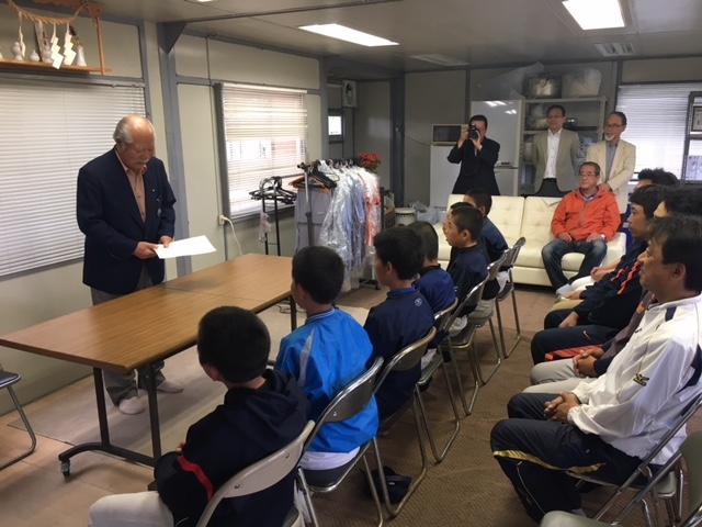 浄化センターグランドに新たに設置された部室にて、入団式が行われました。