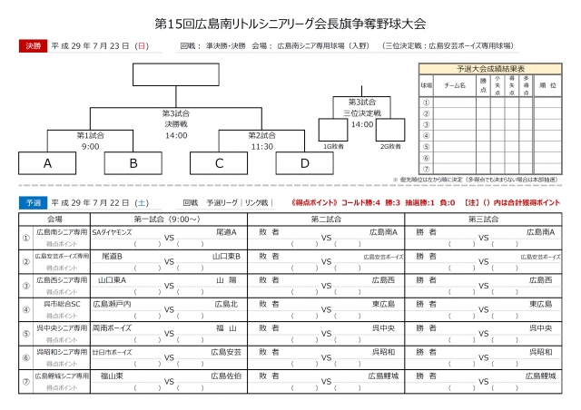 > 第15回広島南リトルシニアリーグ会長旗争奪野球大会 組み合わせ