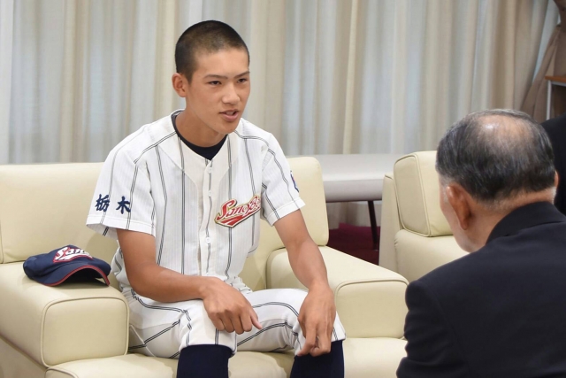 2017ジュニアオールジャパン(野茂ジャパン)に選出された渡辺凌矢選手が岡部正英佐野市長を表敬訪問しました。