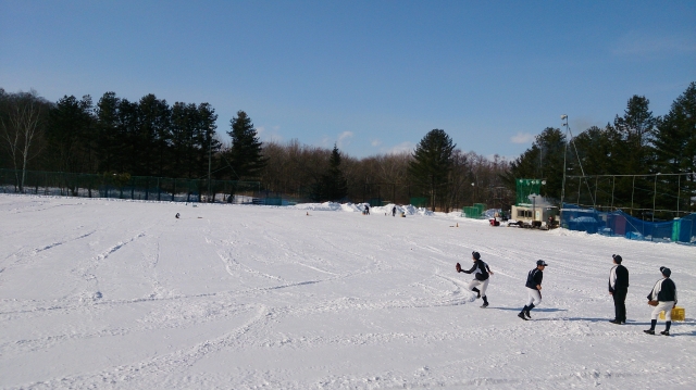 広いグランドと穏やかな天候に感謝です。除雪のご厚意、本当にありがたいですね。選手、指導者一同感謝申し上げます。選手たちは雪上でのノックで汗を流し、生き生きとして野球をやっている姿は本当に楽しそうですね。