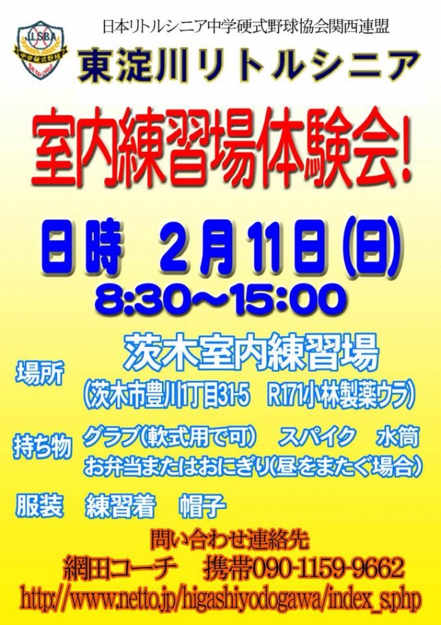 2月11日(日)午前8時30分から午後3時まで茨木室内練習場で第2回体験会を行います。