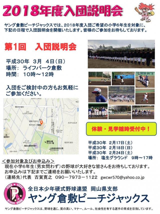 ヤング倉敷ピーチジャクスでは、2018年度入団希望の小学6年生を対象に、下記の日程で入団説明会を開催致します。皆様のご参加をお待ちしています。
