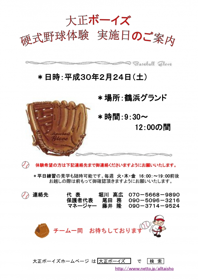 来る平成30年2月24日(土)、「硬式野球体験会」を鶴浜グランドにて実施致します!