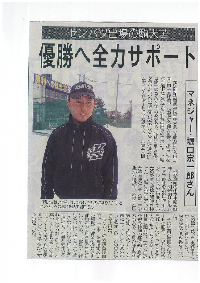 第90回記念選抜高校野球大会(甲子園)に出場する駒澤大学附属高等学校野球部に所属する洞爺湖リトルシニア第9期生OBの堀口宗一郎君が3月22日の室蘭民報の朝刊に記事が掲載されました!!