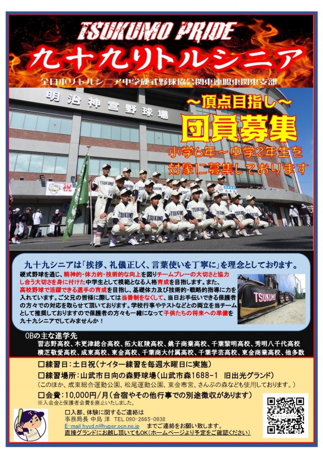 九十九リトルシニアでは現在、2年生(15期生)及び1年生(16期生)の部員を募集しており、6年生の子供達も練習生として硬式野球への準備として歓迎いたしております。男女問わず、硬式野球に興味のある方や高校進学先での硬式野球をお考えのお子様など、成長著しい中学生生活での高校野球への準備期間として共にプレーしてみませんか。