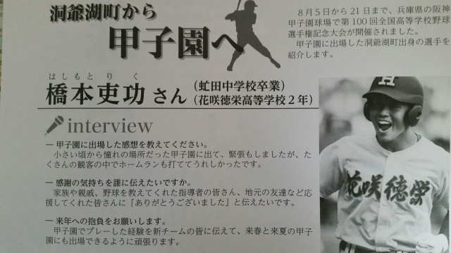とうやこ広報9月号に先に行われました第100回全国高等学校野球選手権記念大会に出場した洞爺湖リトルシニアOB(現:花咲徳栄高等学校)橋本吏功選手の記事が掲載されました!!