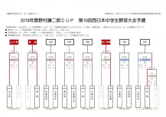 > 2019年度野村謙二郎CUP 第10回西日本中学生野球大会 組合せをUPしました。