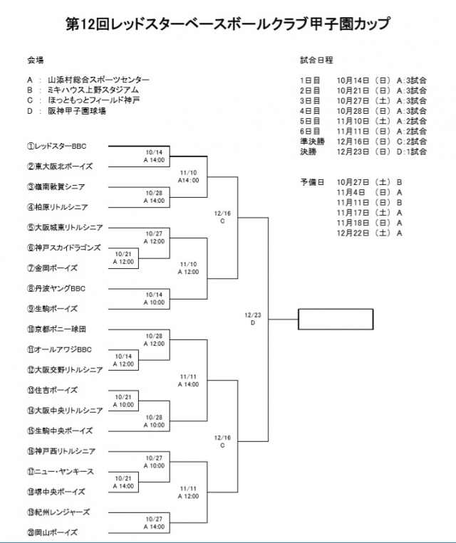 第12回レッドスターベースボールクラブ甲子園カップの日程、組合せが決定致しました。