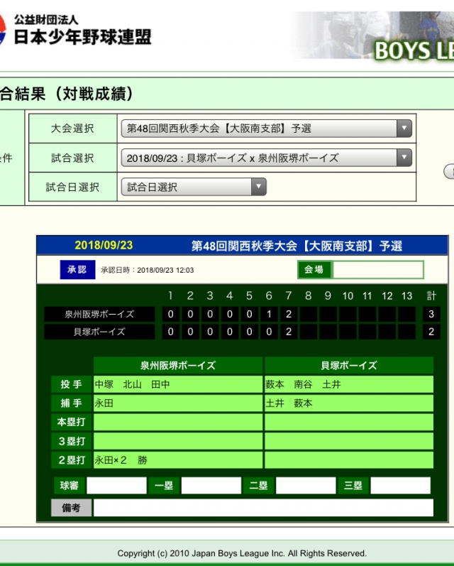 泉州阪堺ボーイズ VS 貝塚ボーイズの試合は