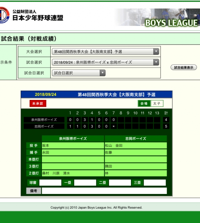 泉州阪堺ボーイズ VS 忠岡ボーイズの試合は