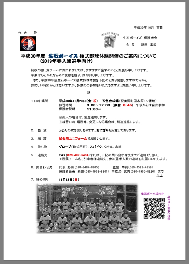 > 11月23日硬式野球体験開催 (2019年春入団選手向け)