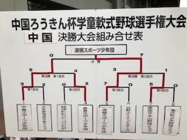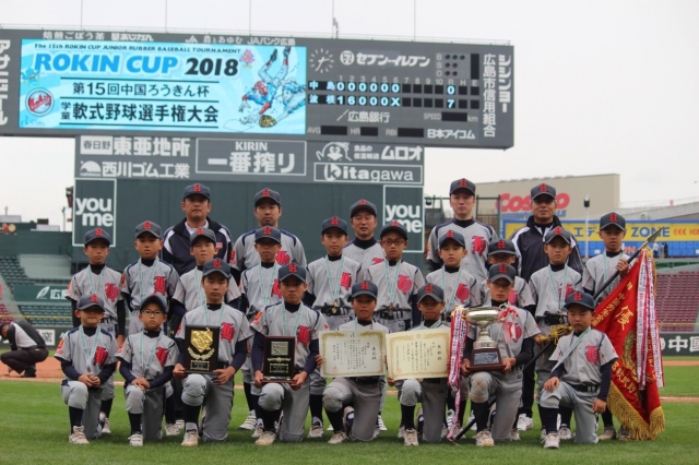 11月17日・18日に広島市のマツダスタジアムで開催された「中国ろうきん杯決勝大会」に島根県代表として出場し、当団といたしましては初の中国1位に輝きました。この大会は、各県予選会を勝ち上がってきた8チームが出場し行われ、年度の中国地区チャンピオンを決める大会になっており、特に大会が行われるのが子供達の憧れ広島カープの本拠地「マツダスタジアム」なので、予選会から大変熱が入る大会となっています。まず、一回戦は鳥取県第2代表の日野ユタイテッドスターズさん、サイドから投げる小学5年生(女子)が素晴らしい投手で、序盤はなかなか点が入りませんでしたが、一点一点を積み重ね結果7対0で勝利。翌日の準決勝は、今年度広島県の主要な大会を制してきた栗原平木山さんで、特に夏に東京で開催された小学生の甲子園「高円宮賜杯マクドナルド・トーナメント」に、広島県代表として出場された文字通り強豪チーム。3回までは両チームともに3人ずつで終わり、4回表にはミスも有り1点を取られ嫌な空気も流れましたが、その裏に、今年度チームを象徴するような多彩な攻撃で3点を取り逆転。あとはエースのKくんが相手チームを抑え、高円宮賜杯出場対決を制しました。決勝戦は、2試合を逆転で勝ち上り、特に準決勝は鳥取県チャンピオンで高円宮賜杯出場組のチームにサヨナラ勝ちで上がってきた地元開催地代表の中島スポ少さん。小柄なチームながらチームワークも良く、勢いを感じさせるチームでしたが、序盤に波根打線がつながり7点を奪い、投げてはOくんが相手チームを無失点に抑え7対0で勝ちました。3年連続で決勝大会に進み、今年こそはと挑んだ今回の大会でしたが、本当に選手たちは良く戦ったと思います。これで、今年度チームの試合は、今週末から3日間にわたり開催される「和田毅杯」のみとなりましたが、10本目の優勝旗を持ち帰るべく、チーム一丸で挑みたいと思います。