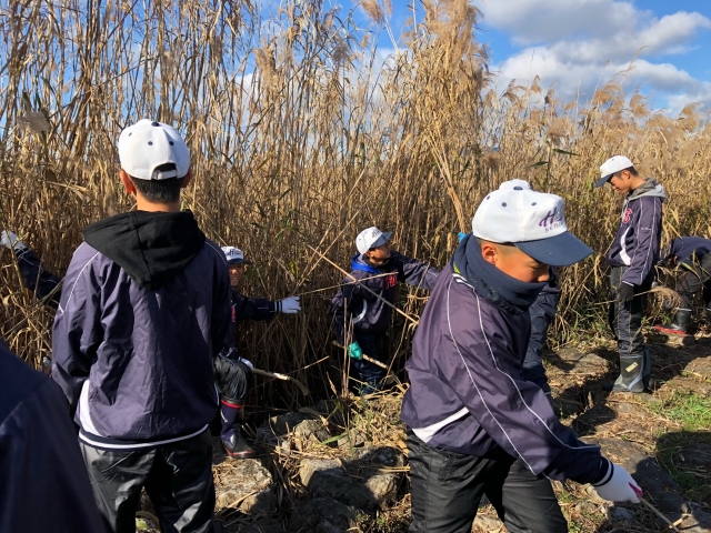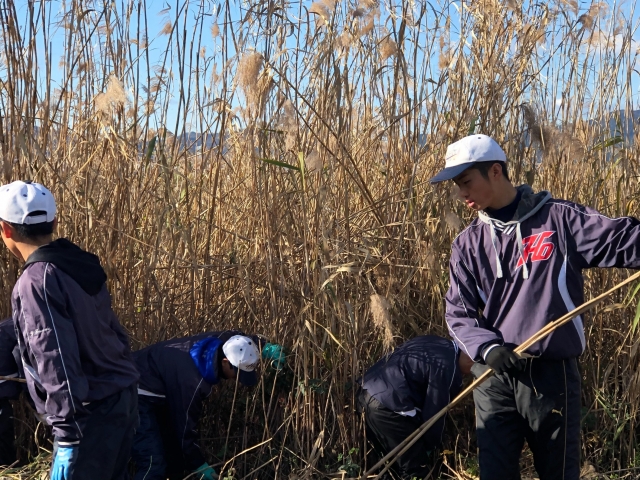 12月8日(土)に2年生は、「ヨシ刈り」のボランティア実践を通じて社会貢献意識の高揚を促すという目的で、毎年恒例となりました琵琶湖ヨシ刈りボランティアに参加しました。