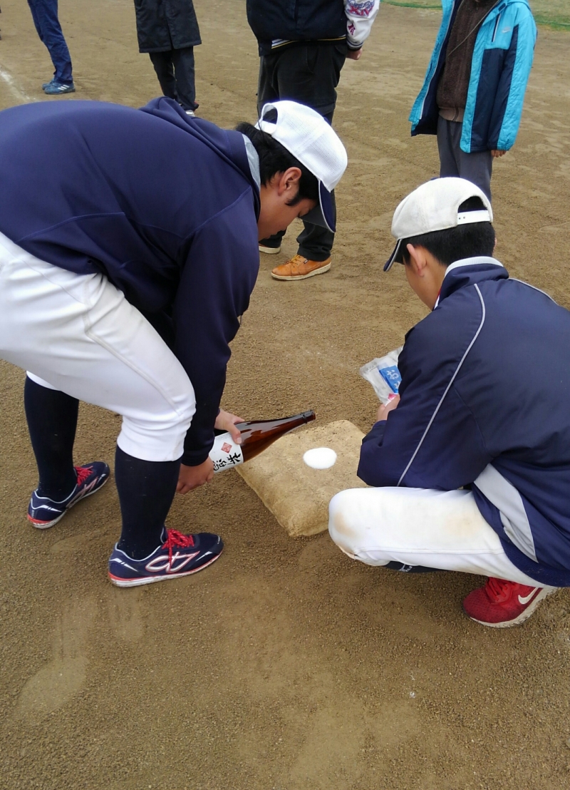 今年1年お世話になったグランドに感謝し、清めの塩とお酒を各ベース・ピッチャーマウンドにまきました。
