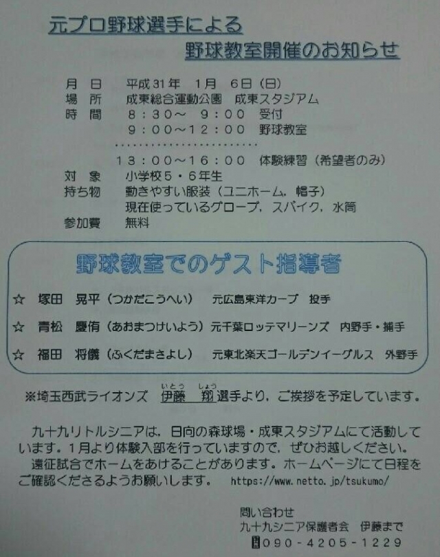 2019年1月6日(日)、九十九リトルシニアが主催する野球教室ならびに体験練習を開催いたします。開催場所は山武市の成東総合運動公園野球場となります。お車でのご来場の際、大変混雑する可能性がございますのでお早めにお越しください。多くの皆様のご参加を、心よりお待ちいたしております。
