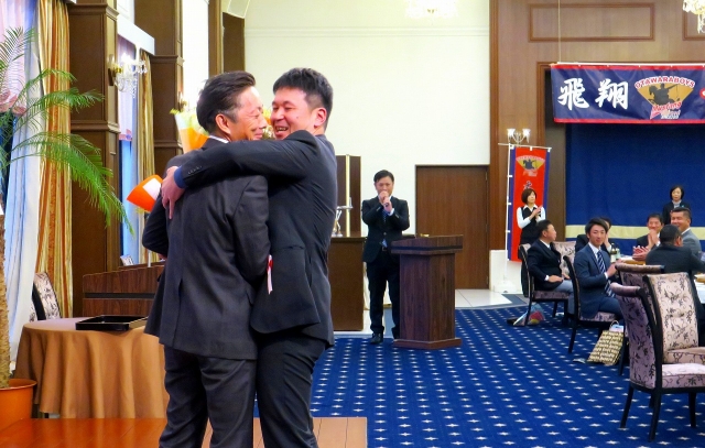 余興では、10期生は、"さくらんぼ"仮装踊りの後、ライザップ前の様な弛んだ上半身を、披露しました。2年後にどれだけ贅肉がとれた体になっているか楽しみですね。9期生は、"水分補給"ダンス&コントの後に、石濱選手が、"なかやまきんに君"を真似た、飴トークを本橋先輩を相手にして行いました。また、星選手が、"ヒロシこと、タクロウです"で、ペーソスが効いた独り言を呟いていました。臼井選手のピアノ伴奏による合唱"旅立ちの日に”は、この場にとても相応しいものでした。DVD鑑賞では、8期生の学童野球時代の写真と今の写真を見比べるシーンがあり、3年間の成長が凄いものだと良く判りました。