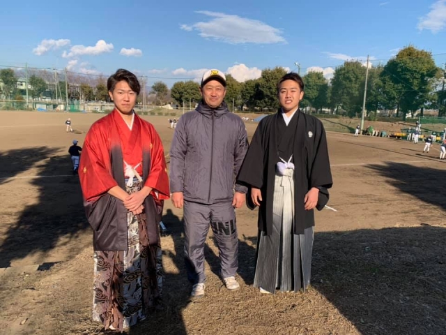 今年成人を迎えた31期生の先輩方々が、晴れ姿を見せにグラウンドに来てくれました。