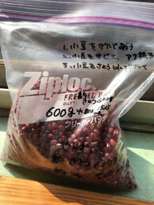 お母さんは差し入れの小豆をストーブの上で