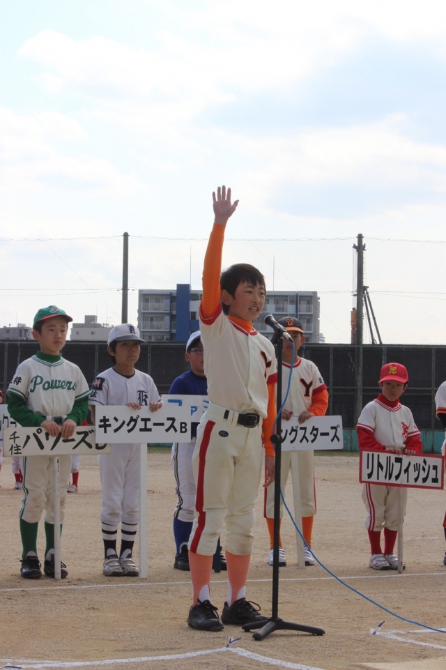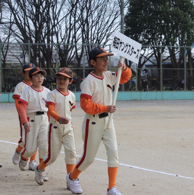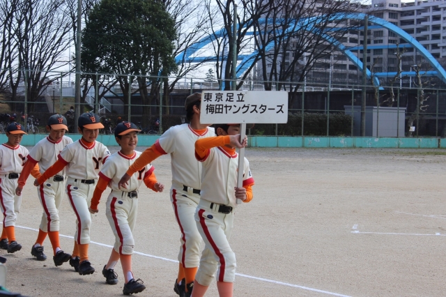 3月17日、千住リーグの開会式が尾竹橋グラウンドで行われました。選手宣誓は梅田ヤングスターズのショウア主将が務めました。コウキ主将、ユイト主将に続き、今年も梅ヤンキャプテンが晴れ舞台に立ちました。写真はお母さんが提供してくれました! 名カメラマンらしく、手ぶれなしでナイスショットです。