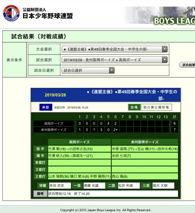 高岡ボーイズVS泉州阪堺ボーイズの試合は
