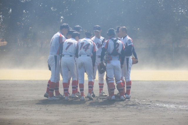 6回2死満塁の追加点のチャンスを逃した後、雨が激しくなり、17分間の中断に。再開の後、流れが変わったと最後7回の攻撃を必死に仕掛けてくる相手に、伊藤選手が立ちはだかりました。ショートで三遊間のヒット性の当りを好捕し、大遠投でアウト。その後、抑えの投手で試合を締めてくれました。3枚目の写真は、雨の後、霧が立ち込めた中で、ナインで円陣を組んだものです。
