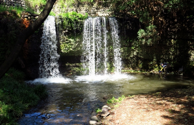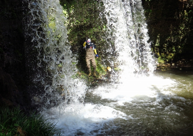 この滝を初めて訪れたのは、練習試合の合間の待ち時間を利用して(グランドから5分もかからずに行けます)。その大きさに、びっくりしました。只、滝壺の周りに空き缶などのゴミが浮いているのが気になりました。そこで、平成から令和に元号が変わる間際、4月28日に清掃活動をしました。星さん、小田部さんが同行して、写真撮影と滝壺で溺れない様に見守ってくれました。大きなゴミ袋2つにゴミを集めて、15分あまりで終了。この活動で、水深が腰の当りまで来る場所を渡り、滝裏に入ることが出来て、とても楽しかったです(写真2枚目)。尚、滝壺近くの水深は、おそらく人の身長くらいはありそうなので、滝に打たれることは大変危険です。くれぐれもやらないようにして下さい。