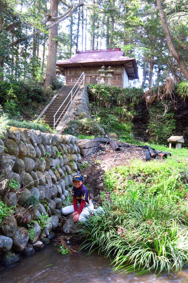 また、滝の上部には、日本武(ヤマトタケル)神社がひっそりと佇ずんでいます。1195年に建立。那須与一が屋島の戦いで扇の的を射落としたのが1185年。源頼朝が征夷大将軍に任命されたのが1192年。那須一族が興隆した時期に、一族の鬼門除けとして、福原城主の那須久隆によって、不動明王を祭ったのがはじまりとされています。825年近く、神社は存在し続け、鎮守の森も守られて来ました。不動川には沢蟹が生息していますが、この森のお蔭で命を繋ぐことができたのでしょう。沢蟹を捕まえに来た永山ヒジリ君にも、そのことを伝えておきたいと思います(写真3枚目)。